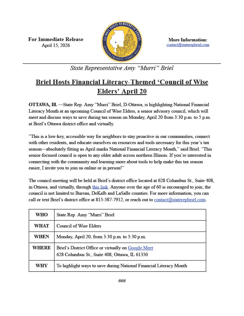 OTTAWA, Ill. —State Rep. Amy “Murri” Briel, D-Ottawa, is highlighting National Financial Literacy Month at an upcoming Council of Wise Elders, a senior advisory council, which will meet and discuss ways to save during tax season on Monday, April 20 from 3:30 p.m. to 5 p.m. at Briel’s Ottawa district office and virtually.